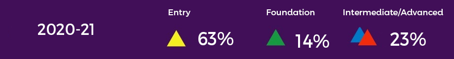 - In 2020-2021 63% of learners were at Entry level. 14% were at Foundation level and 23% at Intermediate or Advanced levels (including Proficiency).