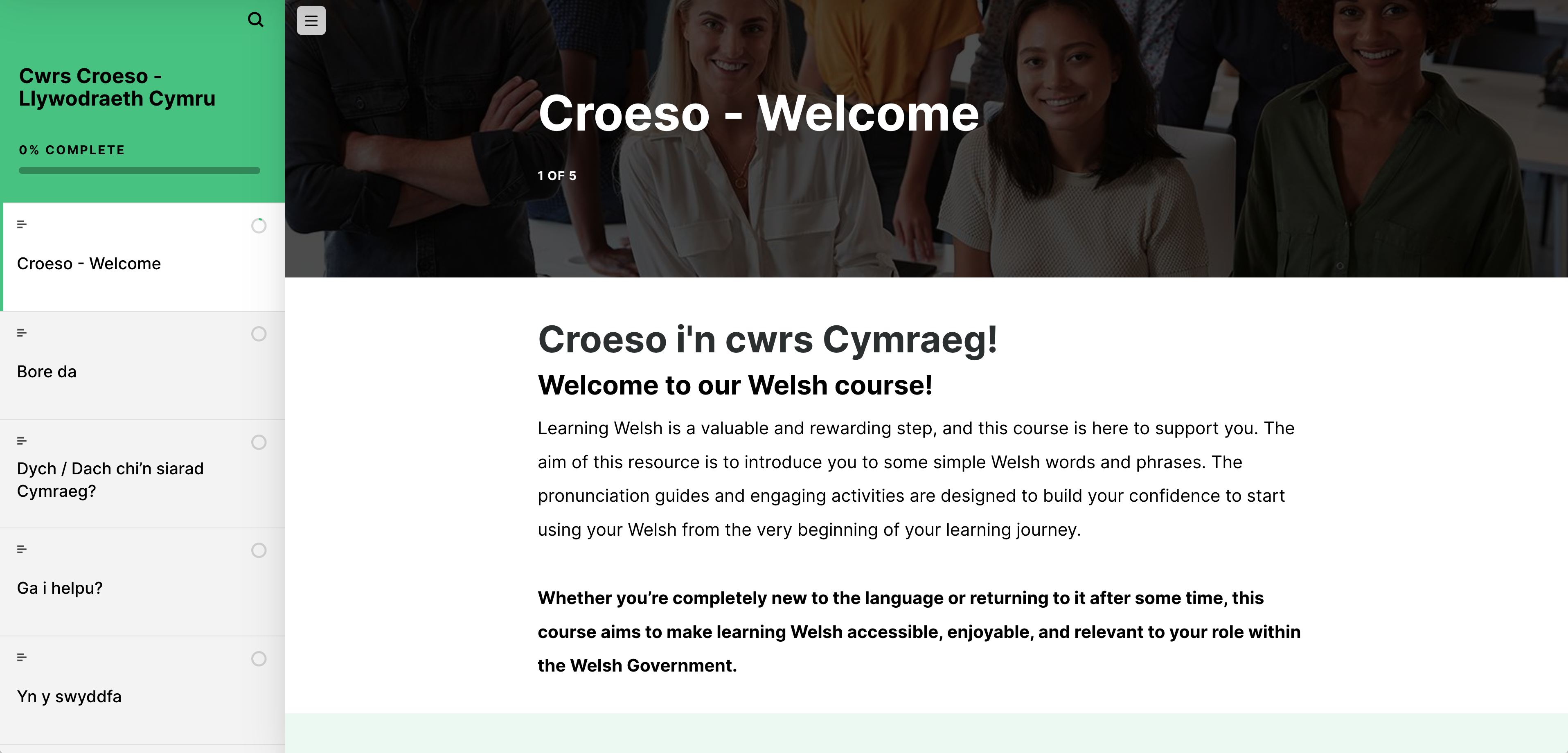 Croeso! Welcome to our CROESO Cymraeg course for Llywodraeth Cymru. This short programme is designed to support your learning journey and provide practical phrases for use in the workplace. As stated in Cymraeg. It belongs to us all, Cymraeg is a valuable asset for our organisation and an important part of our shared culture. We encourage all colleagues to invest in their development and strengthen their Cymraeg skills, regardless of their starting point.